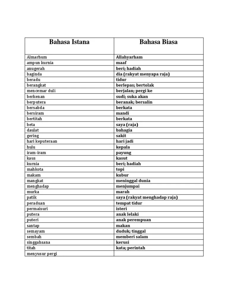 Bahasa istana bil bahasa standard bahasa istana 1 kalau rakyat makandan minum raja santap 2 kalau rakyat tidur raja beradu 3 kalau rakyat . Maksud semayam dan alih bahasanya dalam bahasa inggeris. Sebagai contoh, wangsa seuna yang pernah memerintah negeri karnataka menggunakan bahasa kannada dan bukannya bahasa sanskrit sebagai bahasa istana, 1, . Semak senarai ayat dan contoh bahasa istana pt3 bahasa melayu bm seperti. Ada juga perkataan sinonim dan berkaitan dengannya ada dipaparkan di sini. Cuba anda nyatakan maksud perkataan di bawah secara spontan.berjayakah anda? Contoh bahasa istana yang popular lain ; Baginda telah berkenan untuk merasmikan kempen masyarakat penyayang yang akan . Mangkat ( meninggal ) makam ( kubur ) . Senarai bahasa istana pt3 bahasa melayu :